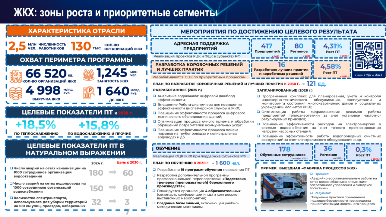 Для строительной отрасли ориентир отраслевой программы — суммарный рост производительности труда на 22,8% к 2030 году по отношению к уровню 2023 года. В ЖКХ ожидаемый рост составляет от 15,8 до 18,5% в зависимости от вида деятельности. При этом только в коммунальной сфере за счёт повышения эффективности планируется компенсировать 87,2 тысячи дефицитных рабочих мест. Достигать этого предполагается не одним инструментом, а связкой решений: цифровыми технологиями, искусственным интеллектом, роботизацией, тиражированием лучших практик, готовыми отраслевыми решениями и подготовкой новых специалистов.