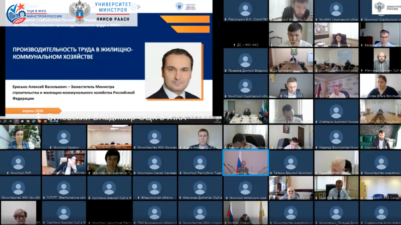 7 апреля 2026 года состоялось совещание Минстроя России с субъектами Российской Федерации «Повышение производительности труда в ЖКХ». Встреча прошла под председательством заместителя Министра строительства и жилищно-коммунального хозяйства Российской Федерации Алексея Васильевича Ересько и была посвящена практической работе регионов — от программ и дорожных карт до обучения, адресной поддержки предприятий и внедрения готовых решений.