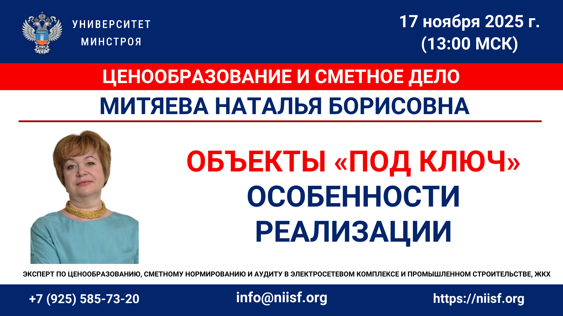 Митяева Наталья Борисовна – эксперт Университета Минстроя НИИСФ РААСН (ценообразование, сметное нормирование и аудит). Независимый эксперт НО ТЦА. Специалист экспертной группы Комиссии по ценообразованию и ТЦА при Общественном Совете Минстроя РФ. Преподаватель кафедры «Экономика и управление в строительстве» ГУУ (г. Москва)