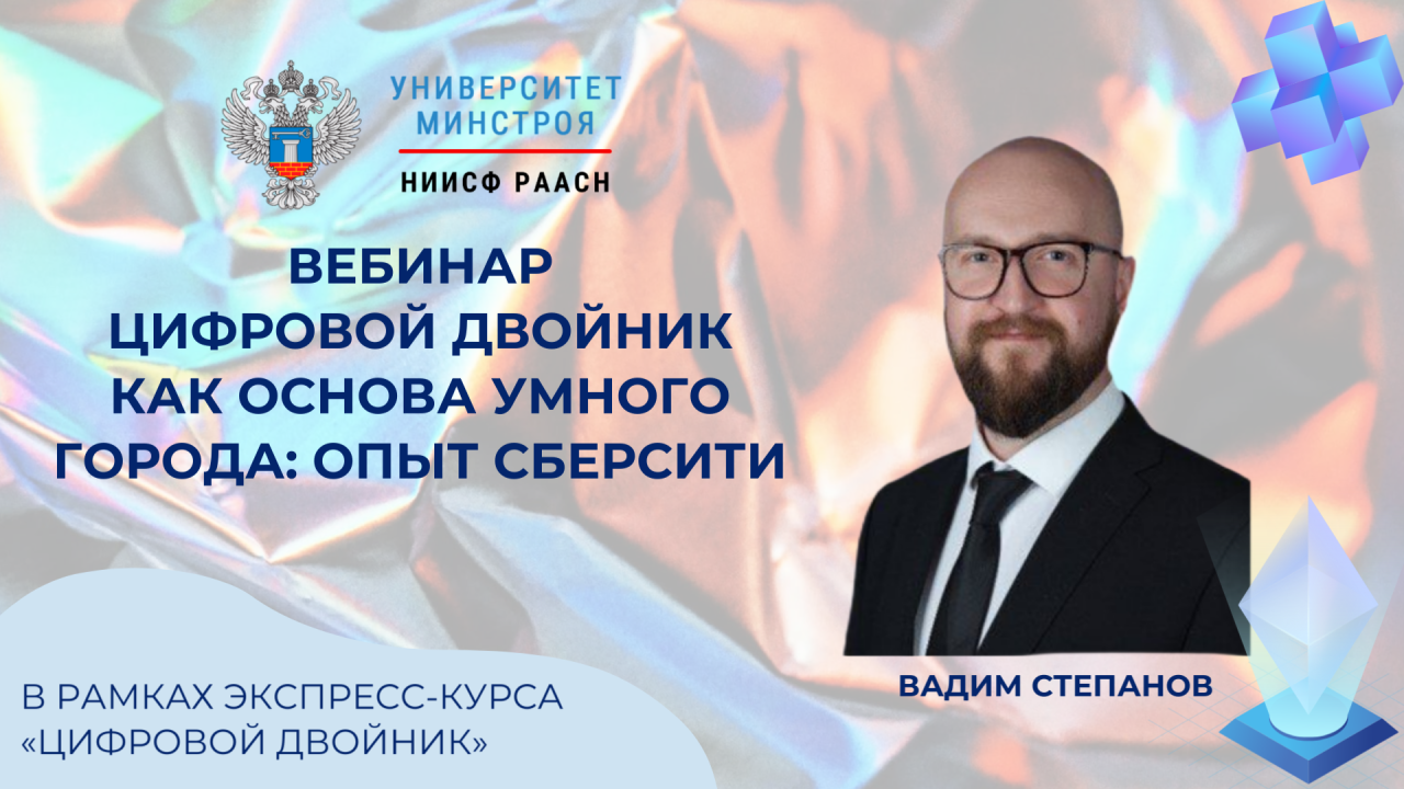 Спикер вебинара — Вадим Валерьевич Степанов, директор департамента технологий информационного моделирования «СберСити» АО «Рублево-Архангельское», ведущий эксперт Университета Минстроя НИИСФ РААСН.