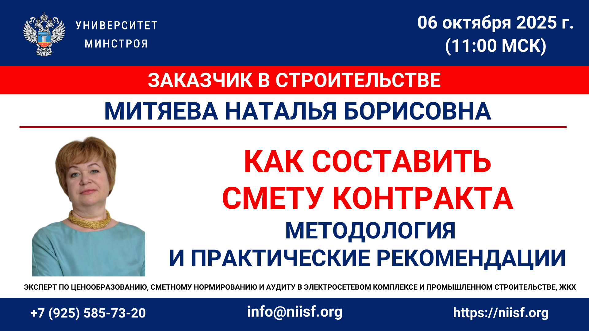 Митяева Наталья Борисовна – эксперт Университета Минстроя НИИСФ РААСН (ценообразование, сметное нормирование и аудит). Независимый эксперт НО ТЦА. Специалист экспертной группы Комиссии по ценообразованию и ТЦА при Общественном Совете Минстроя РФ. Преподаватель кафедры «Экономика и управление в строительстве» ГУУ (г. Москва)